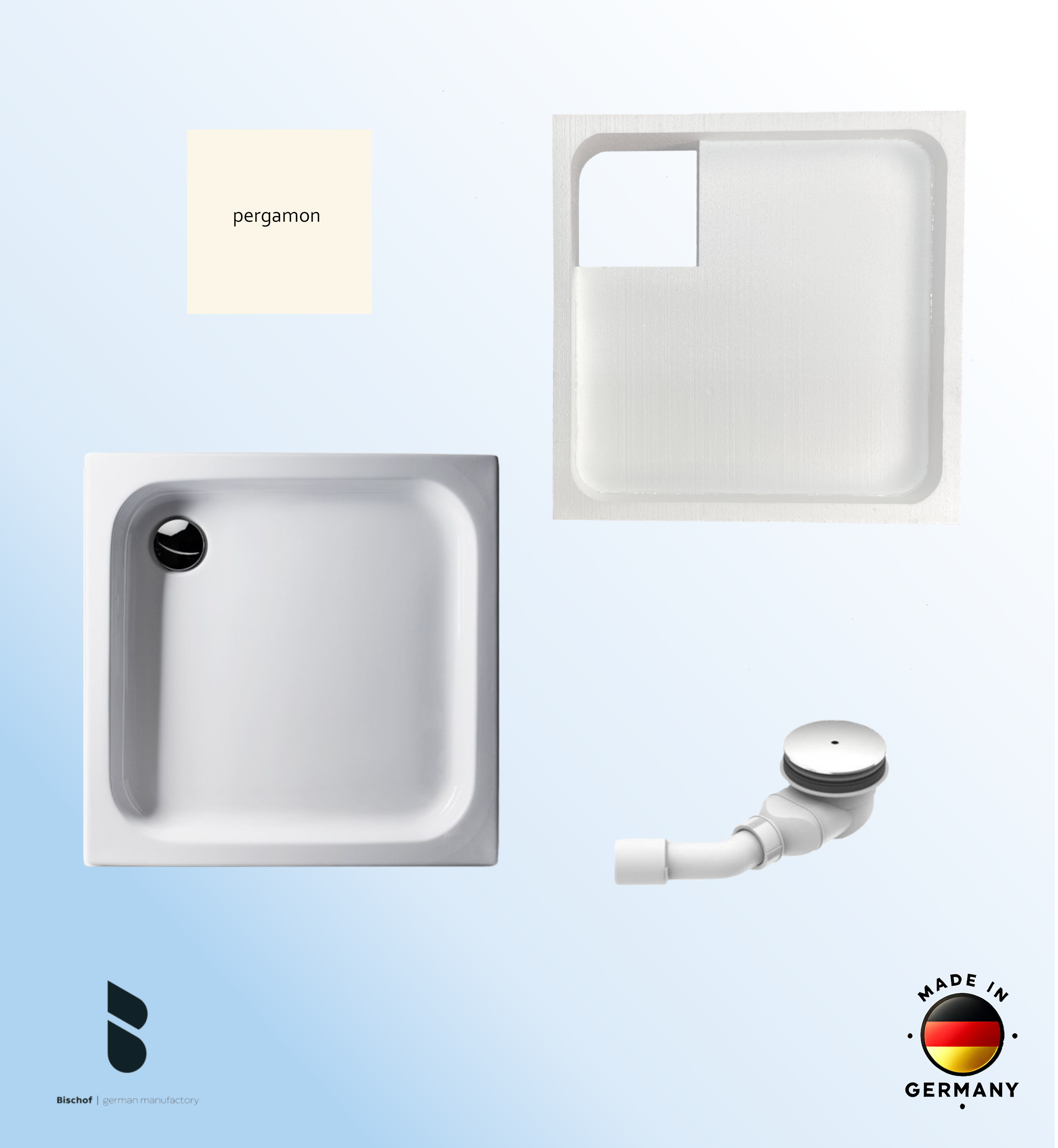 KOMPLETT-PAKET: Duschwanne 90 x 90 cm, Farbe: PERGAMON flach 6,5 cm Acryl + Styroporträger/Wannenträger + Ablaufgarnitur chrom DN 90