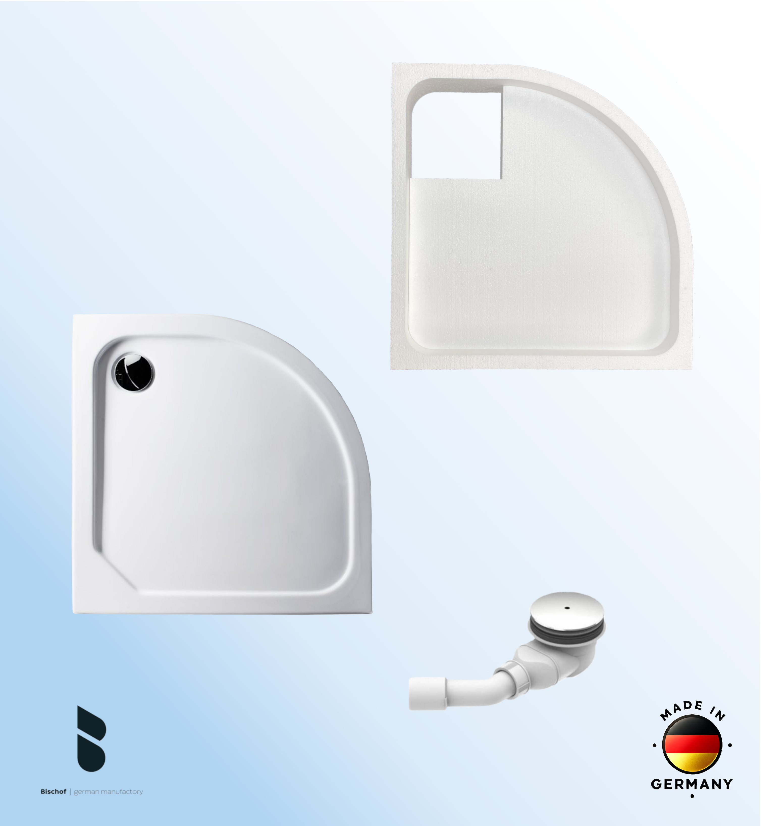 KOMPLETT-PAKET: Duschwanne 90 x 90 cm Viertelkreis Radius 55, superflach 2,5 cm weiß Acryl + Styroporträger/Wannenträger + Ablaufgarnitur chrom DN 90
