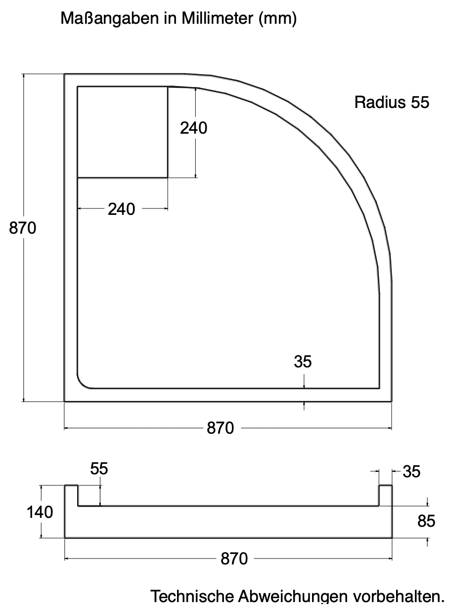 - für Viertelkreis-Duschwannen, Radius wählbar (R50 oder R55)