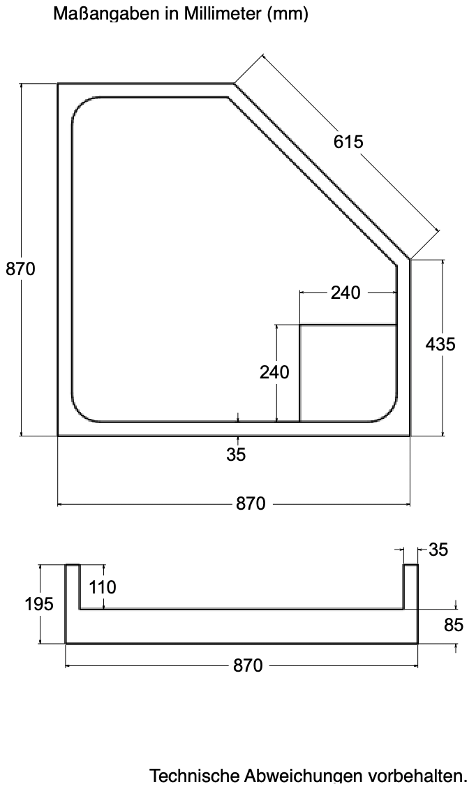 - Ablaufloch wie abgebildet (kann aber nach Kundenwunsch geändert werden)
